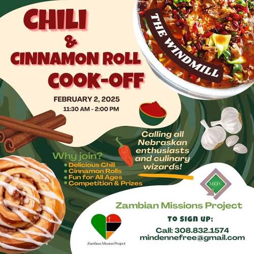 Zambia Mission Project is hosting a chili & cinnamon roll cook-off on February 2 from 11:30 AM - 2:00 PM. Sign up to bring your best chili or cinnamon roll by calling (308) 832-1574 or email mindennefree@gmail.com. If you don't want to compete, come and try enjoy delicious chili and cinnamon rolls!